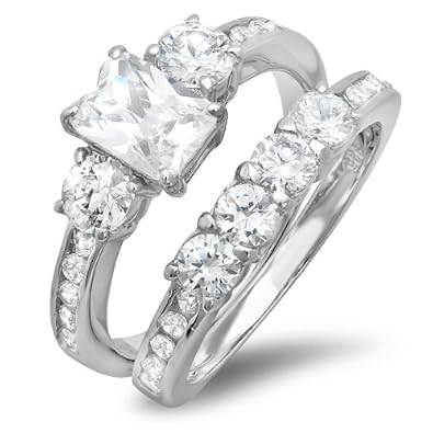 Product Title : 3 CT Sterling Silver 3 stone Ladies Emerald and Round cut Cubic Zirconia CZ Wedding Bridal Engagement Ring with Matching Band Set (Available in size 6, 7, 8) special offers